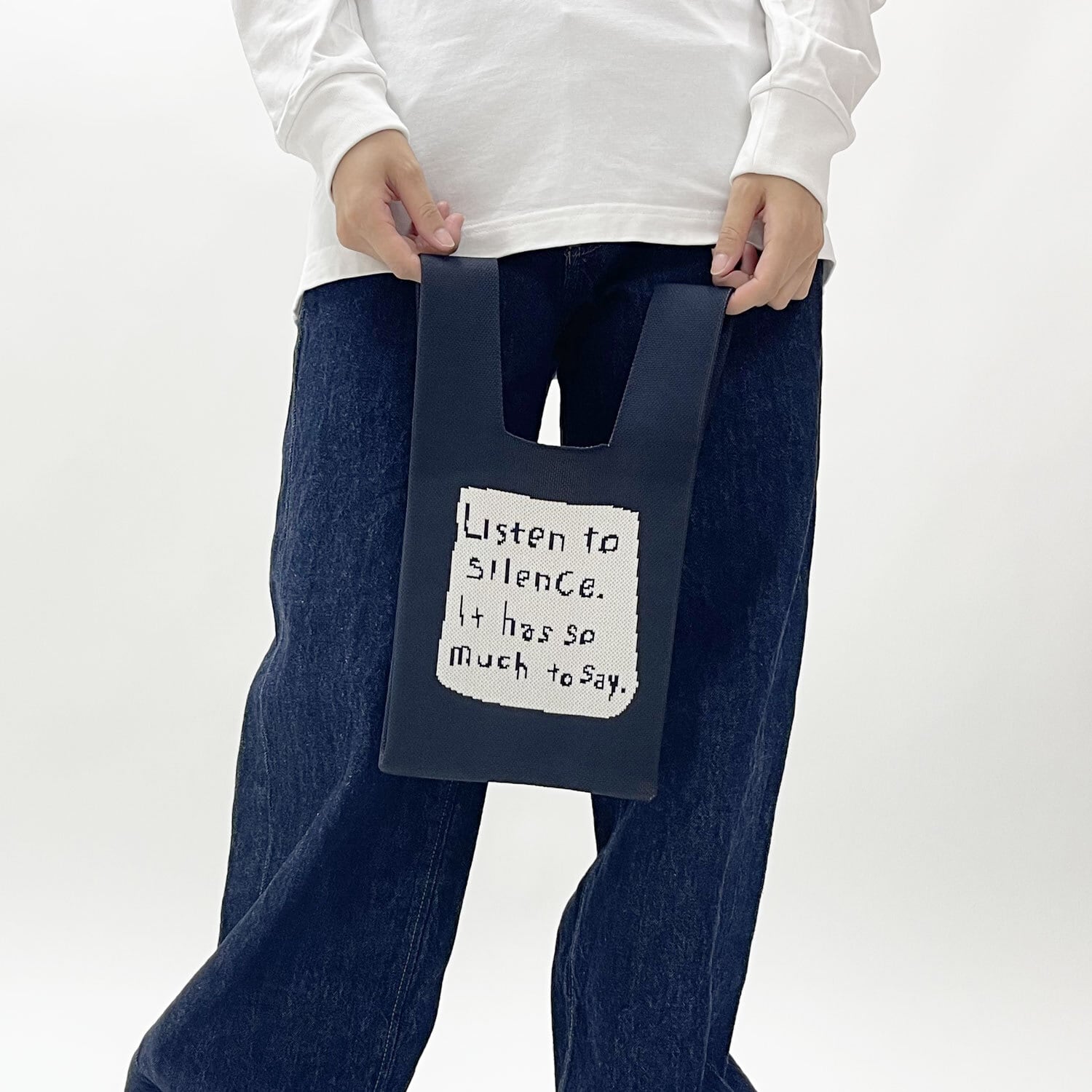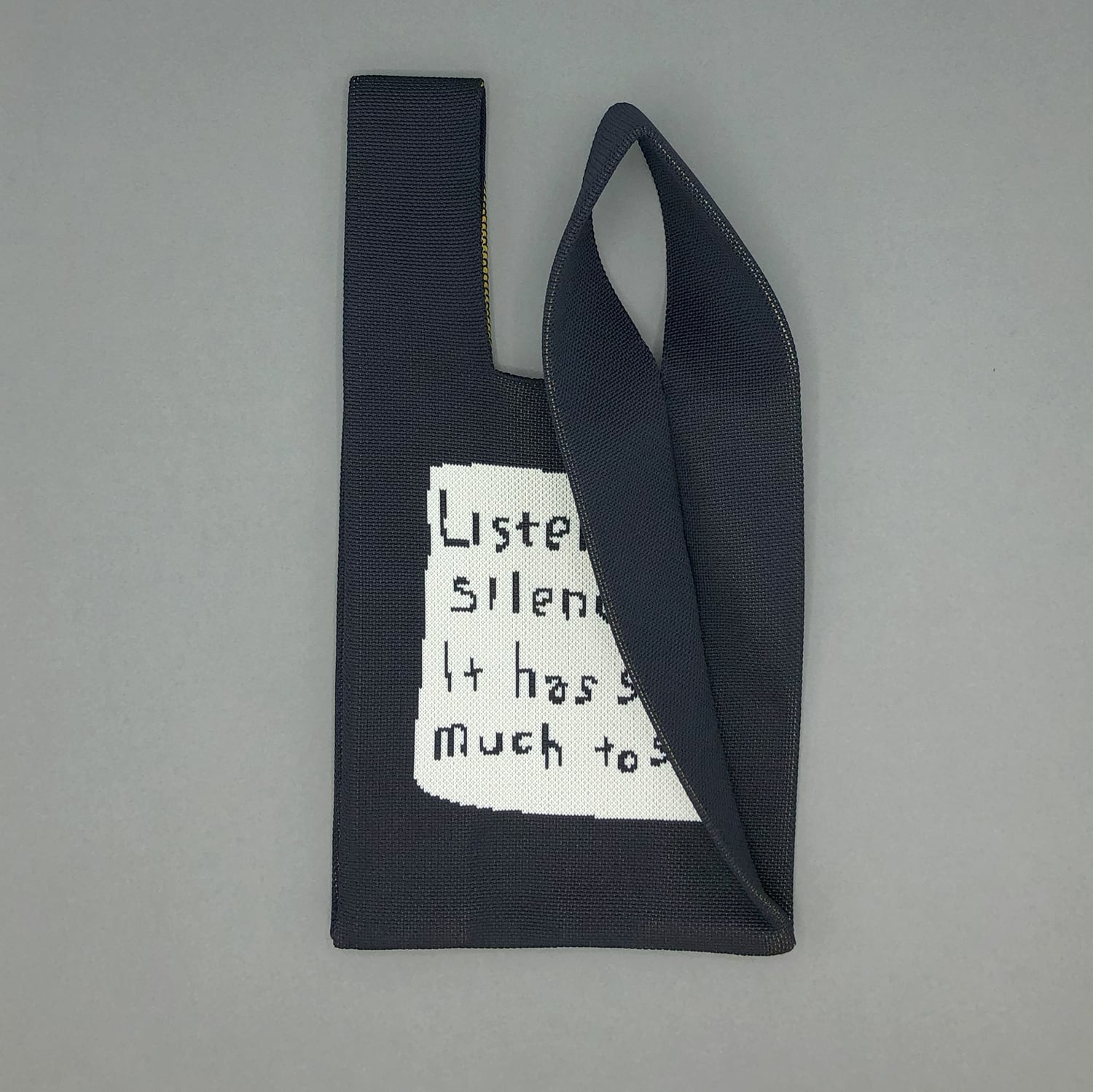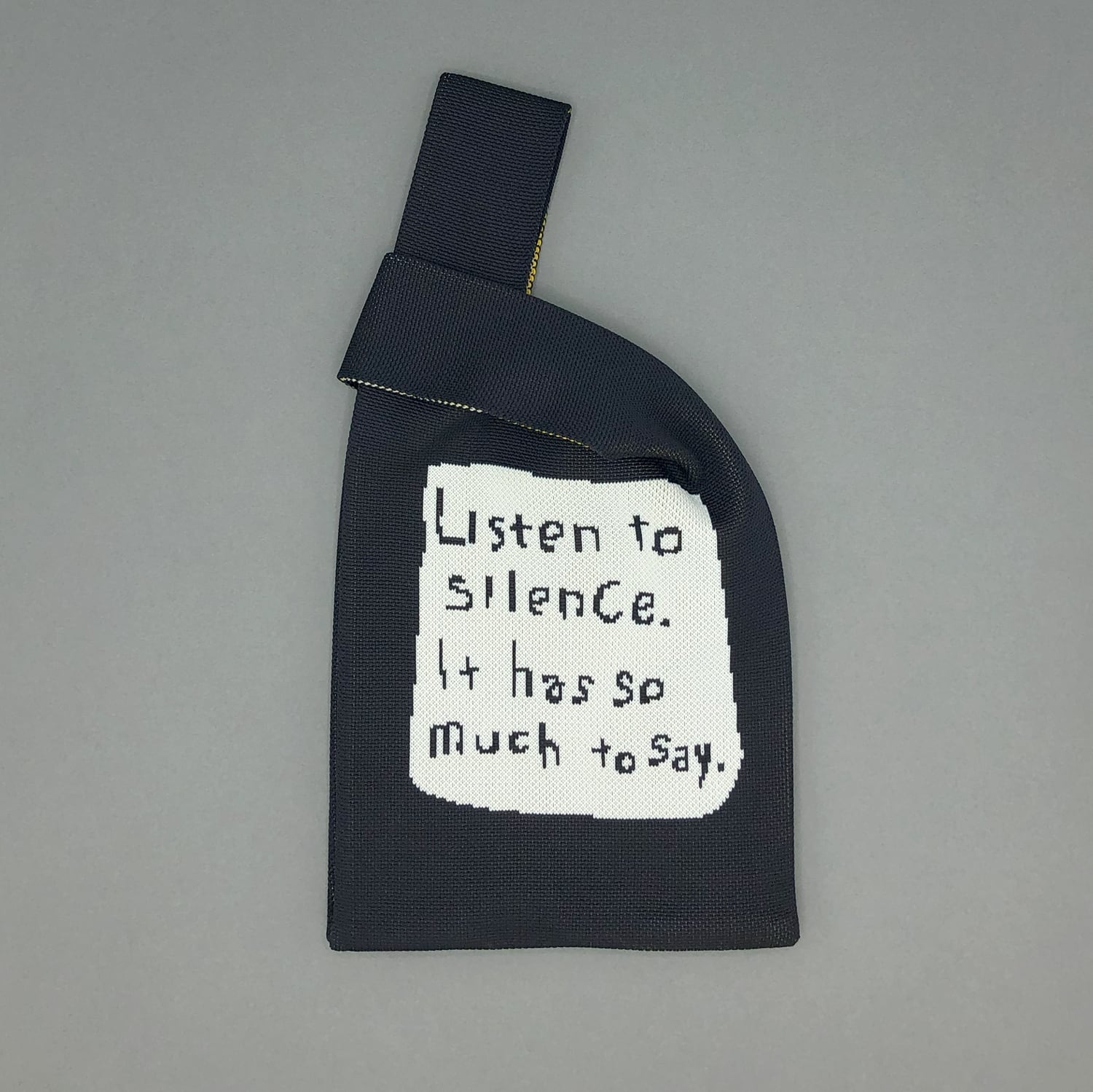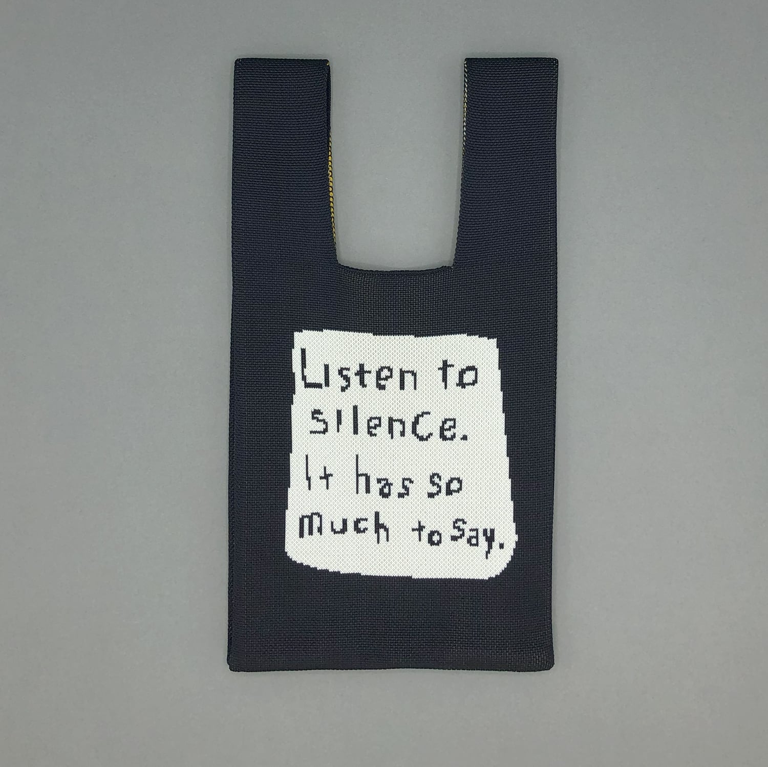 イエローのうさぎの作品と『Listen to silence. It has so much to say.』のテキストが両面にあらわれるダブルフェイス仕様。