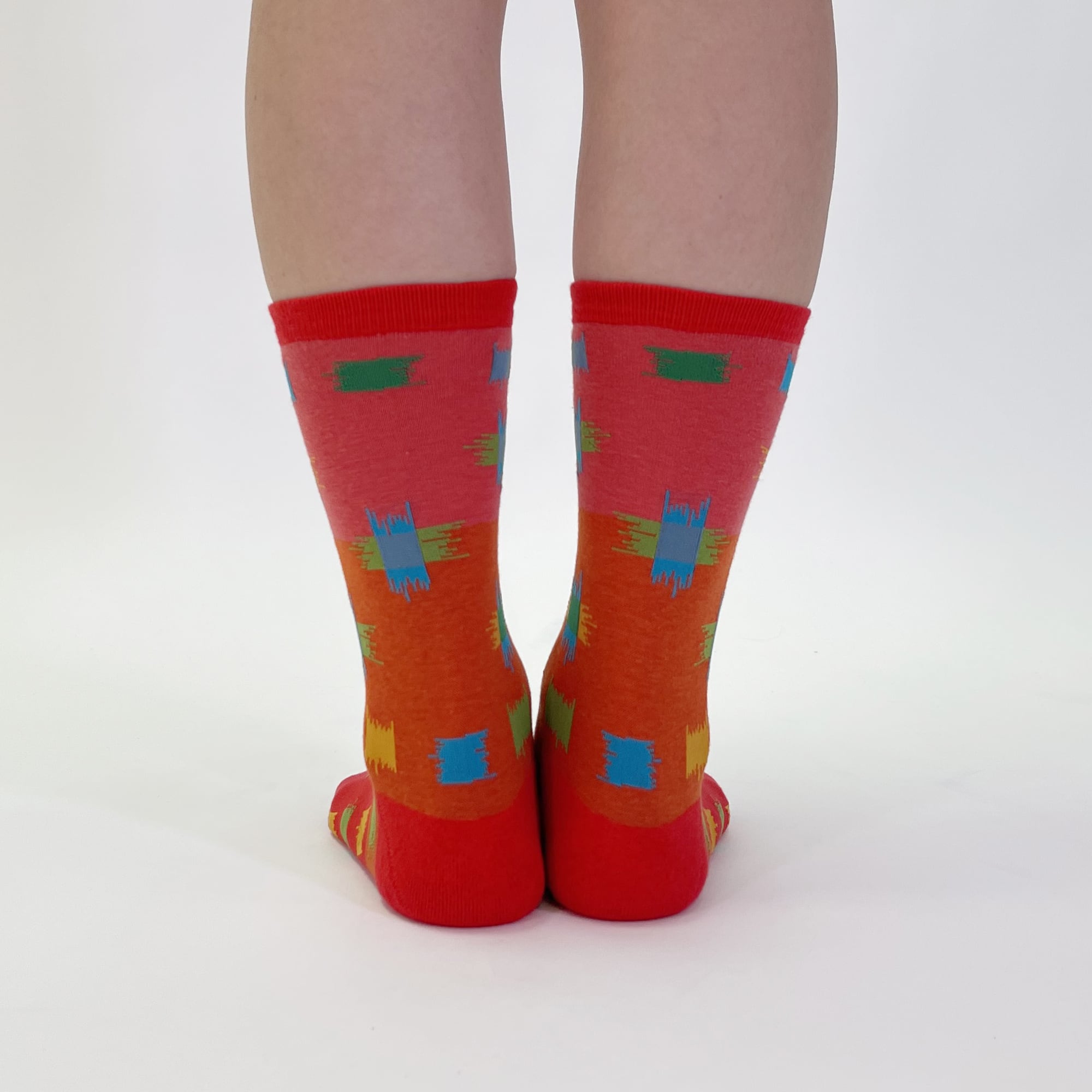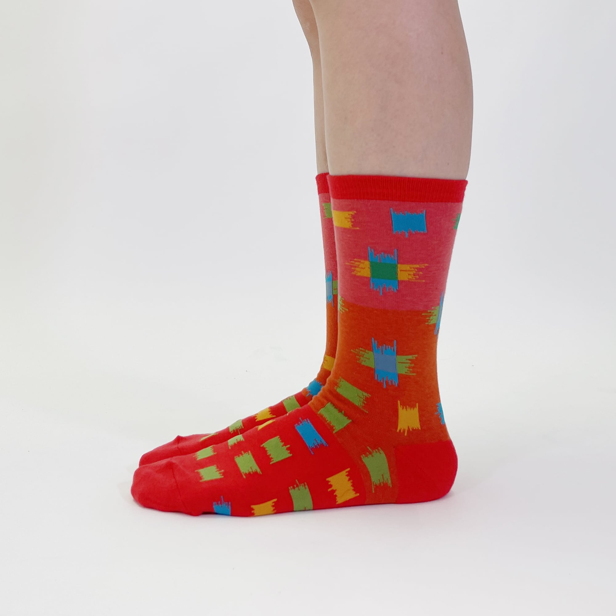 『IKAT STEPS』と題されたラインナップは、靴下を履いて歩く事や伝統から現代のライフスタイルをつなぐ歩みだったり、絣糸の動き(柄のズレ)のような意味合いが込められたソックスシリーズです。