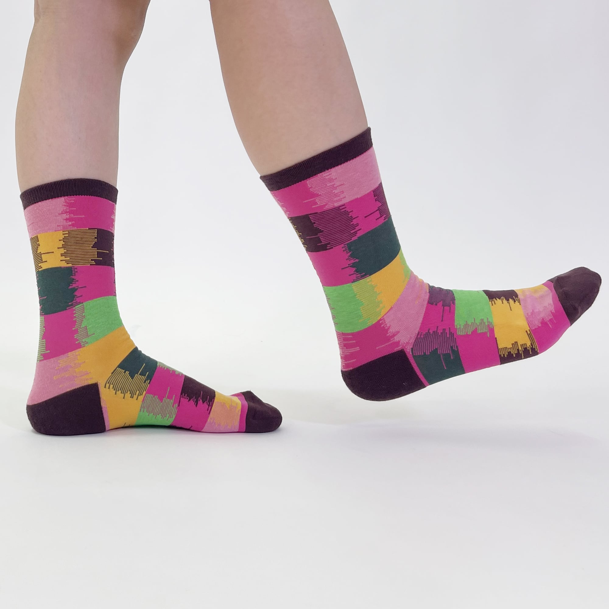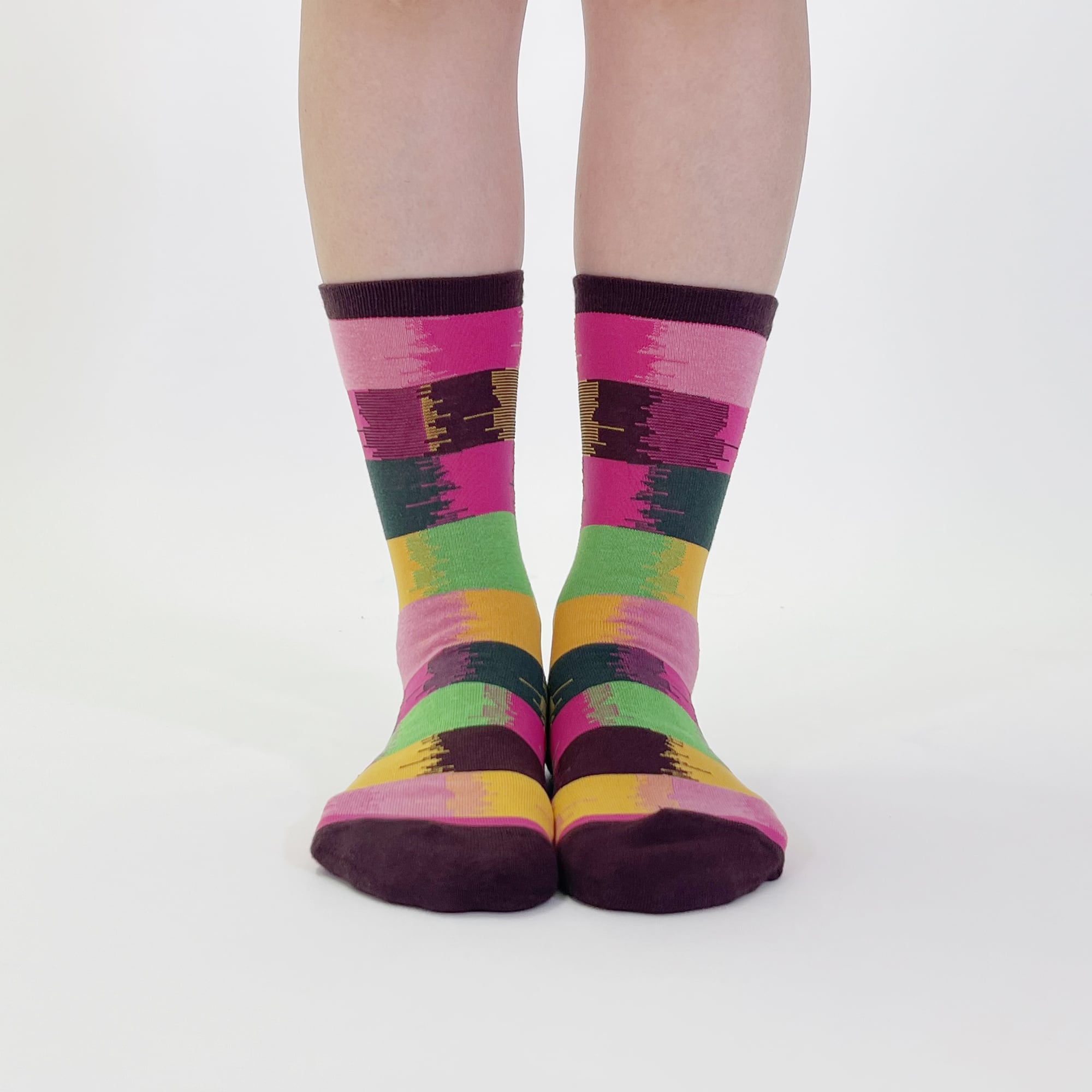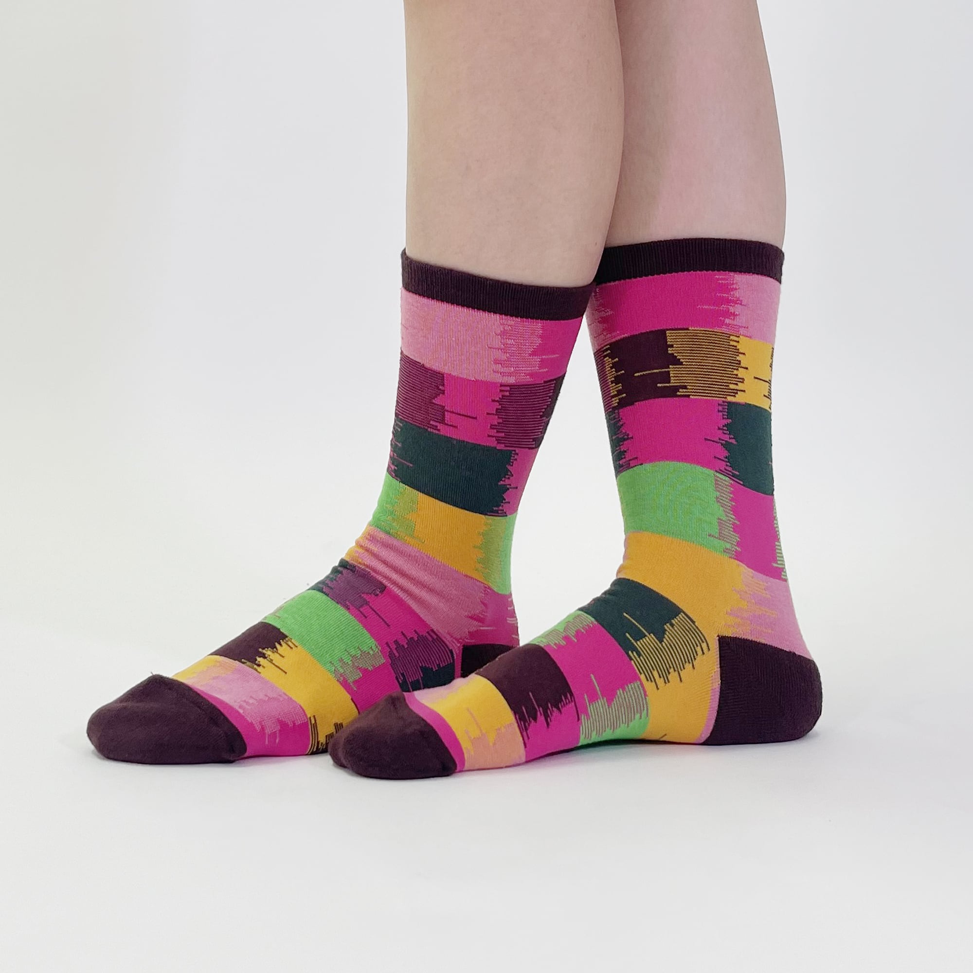 『IKAT STEPS』と題されたラインナップは、靴下を履いて歩く事や伝統から現代のライフスタイルをつなぐ歩みだったり、絣糸の動き(柄のズレ)のような意味合いが込められたソックスシリーズです。