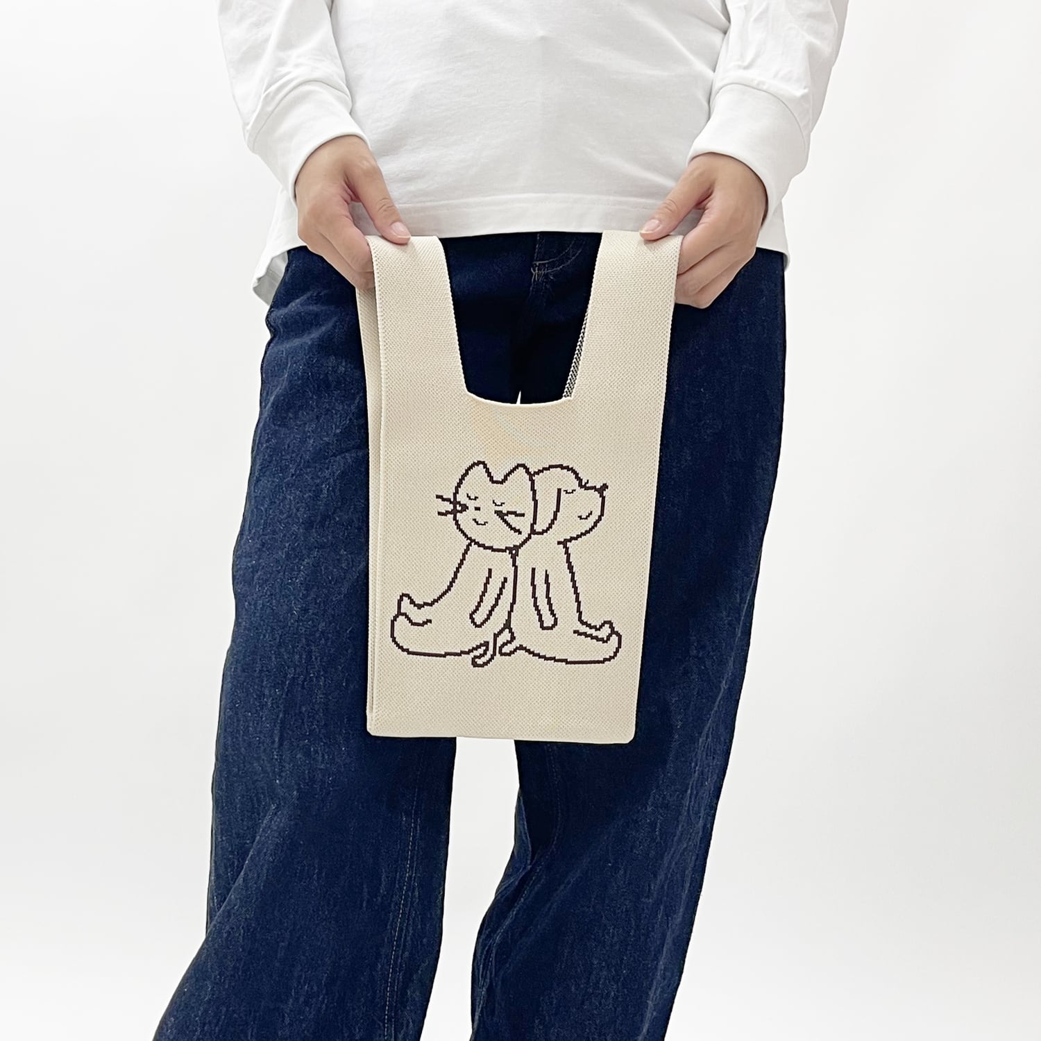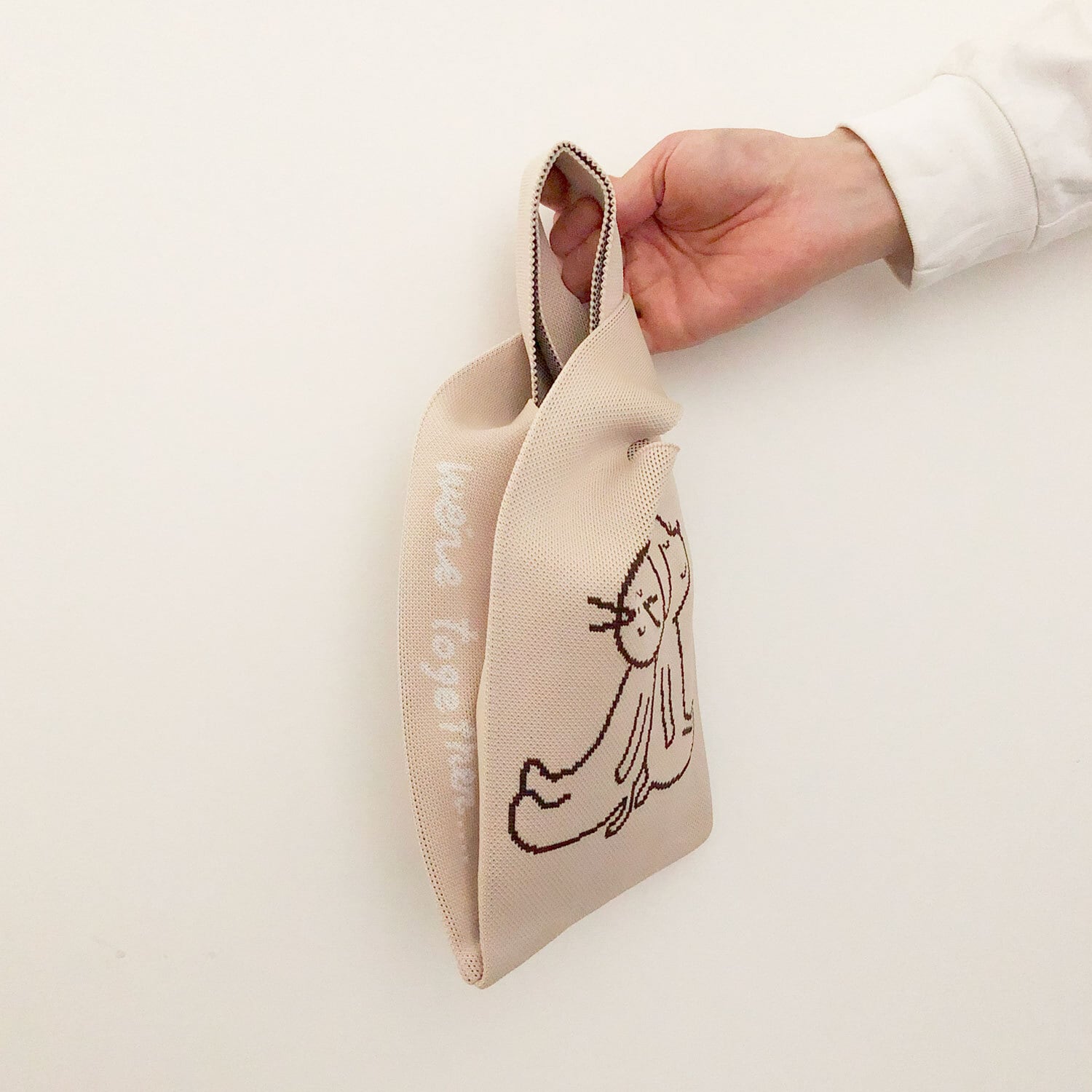 人や時間や空気が作り出す雰囲気、小さなストーリーを大事にイラストレーションを描く江夏潤一さんのイラストが再現されたニットミニマルシェバッグです。