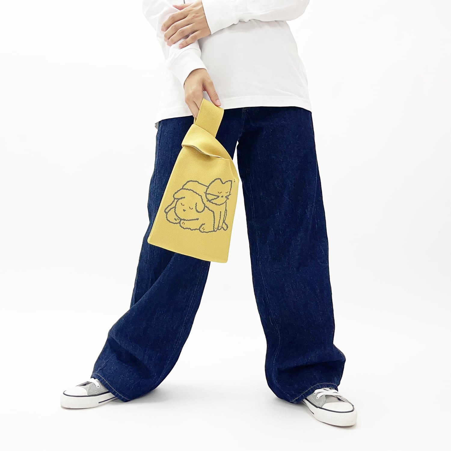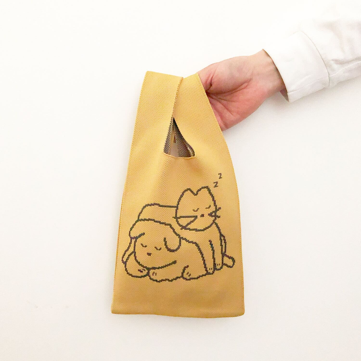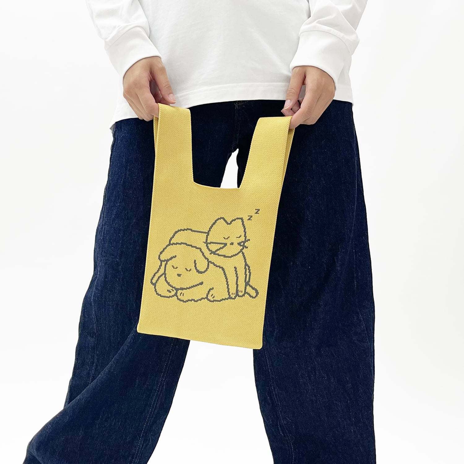 人や時間や空気が作り出す雰囲気、小さなストーリーを大事にイラストレーションを描く江夏潤一さんのイラストが再現されたニットミニマルシェバッグです。