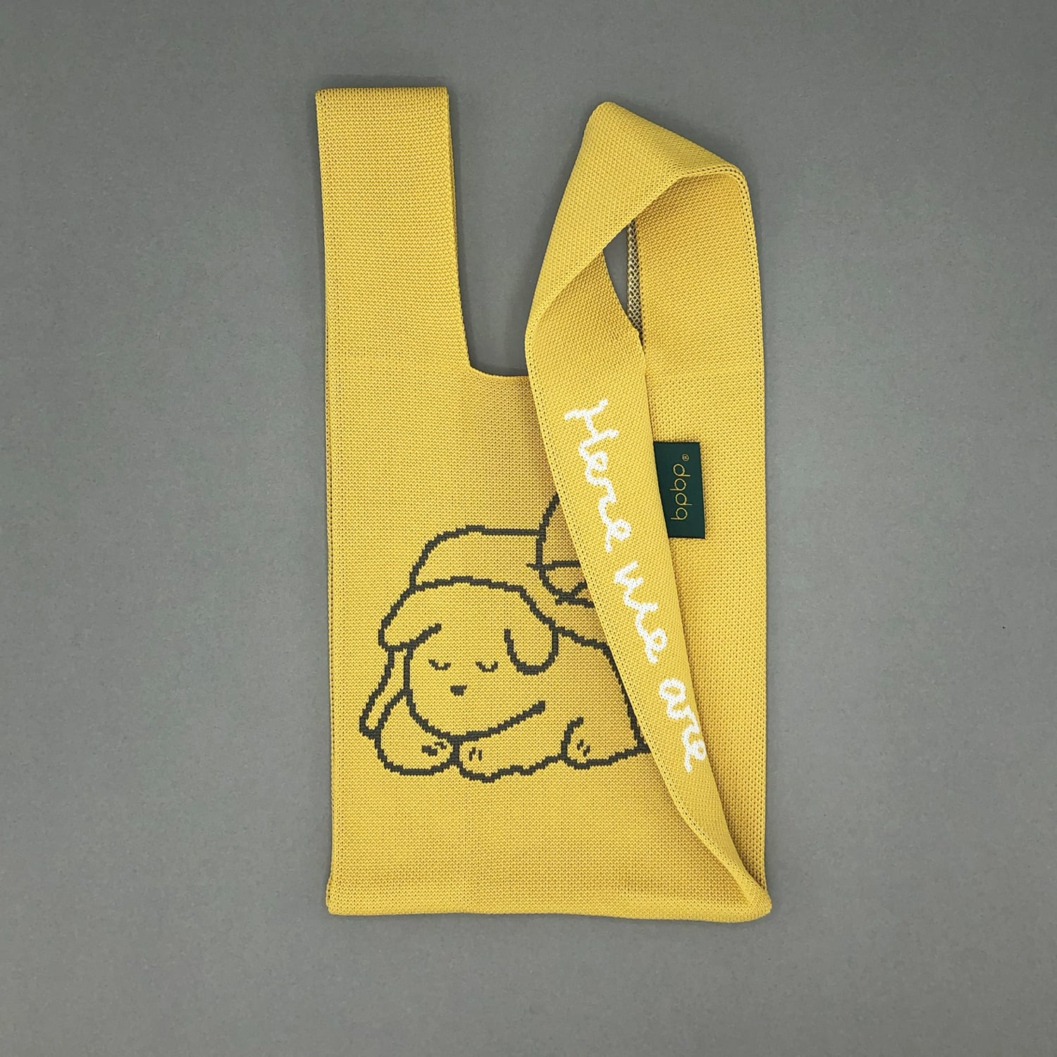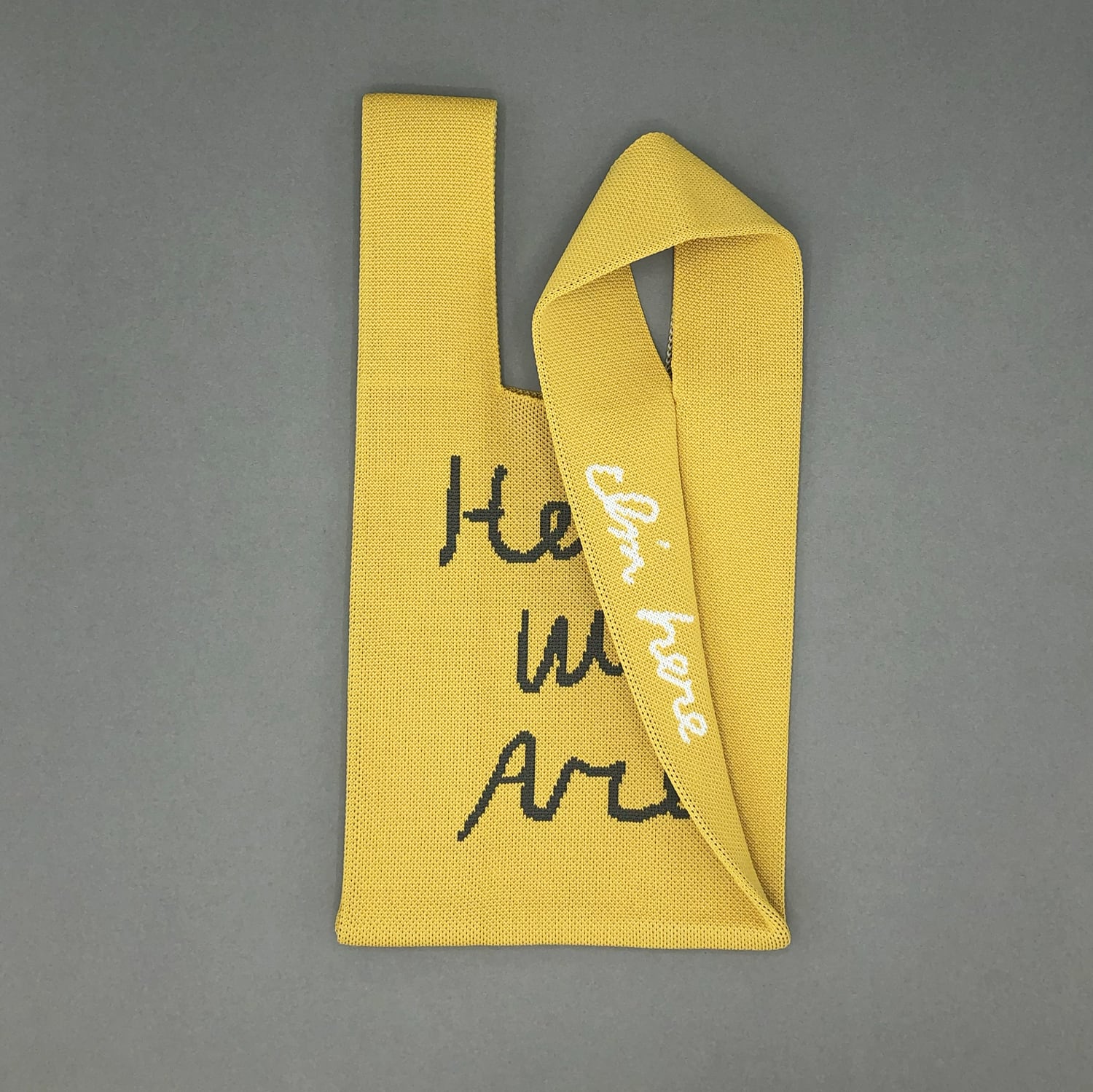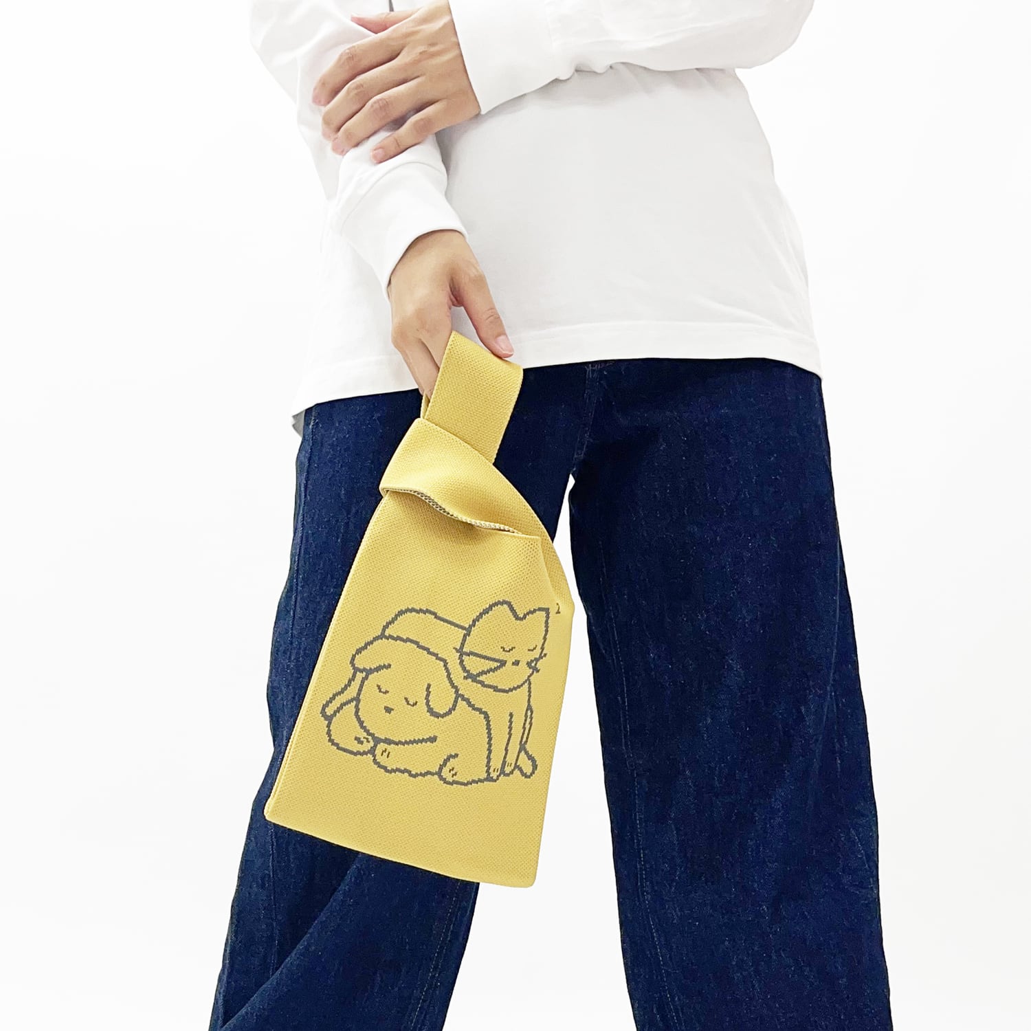 人や時間や空気が作り出す雰囲気、小さなストーリーを大事にイラストレーションを描く江夏潤一さんのイラストが再現されたニットミニマルシェバッグです。