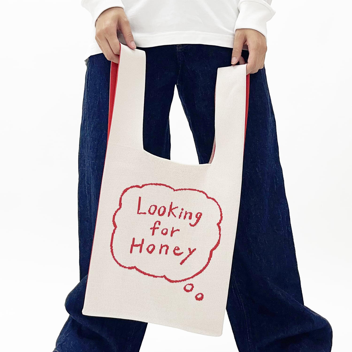 線画のクマのイラスト作品と『Looking for Honey』のメッセージが両面にあらわれるダブルフェイス仕様。