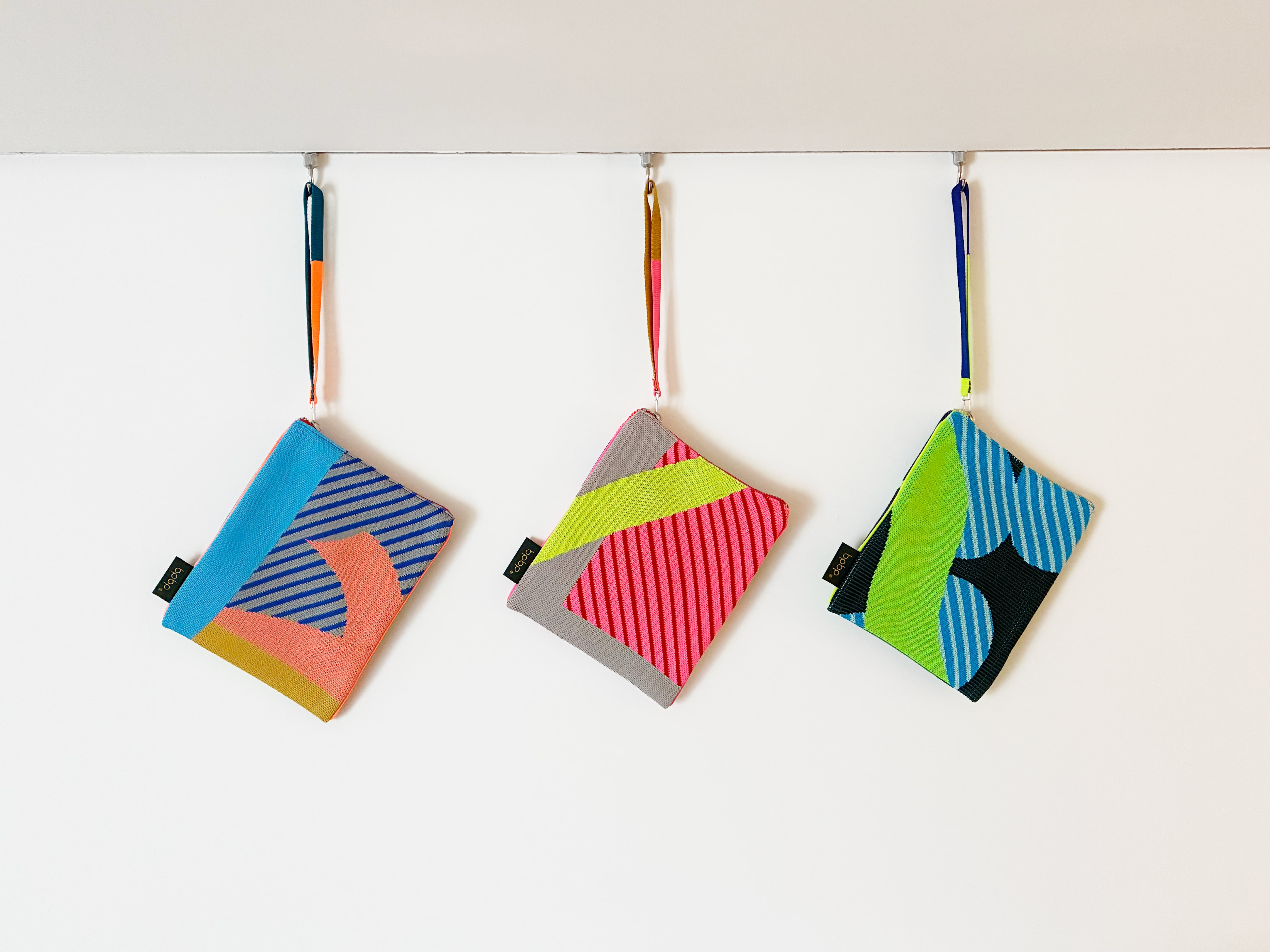 テキスタイルデザイナー 鈴木マサルさんが表現する色柄が再現されたパイピング ハンドストラップ ニットバッグ。