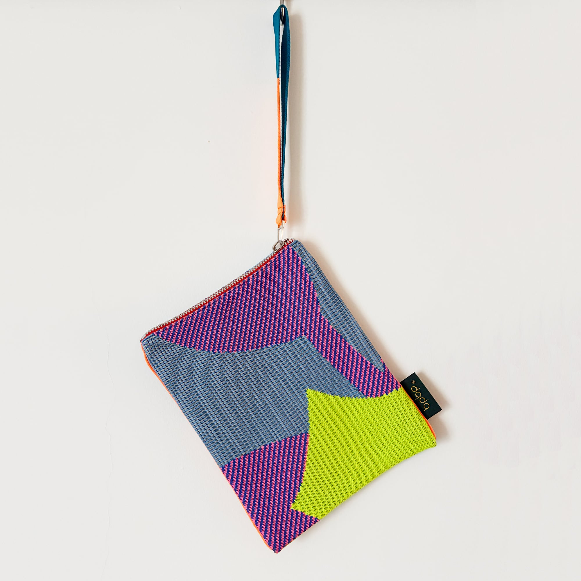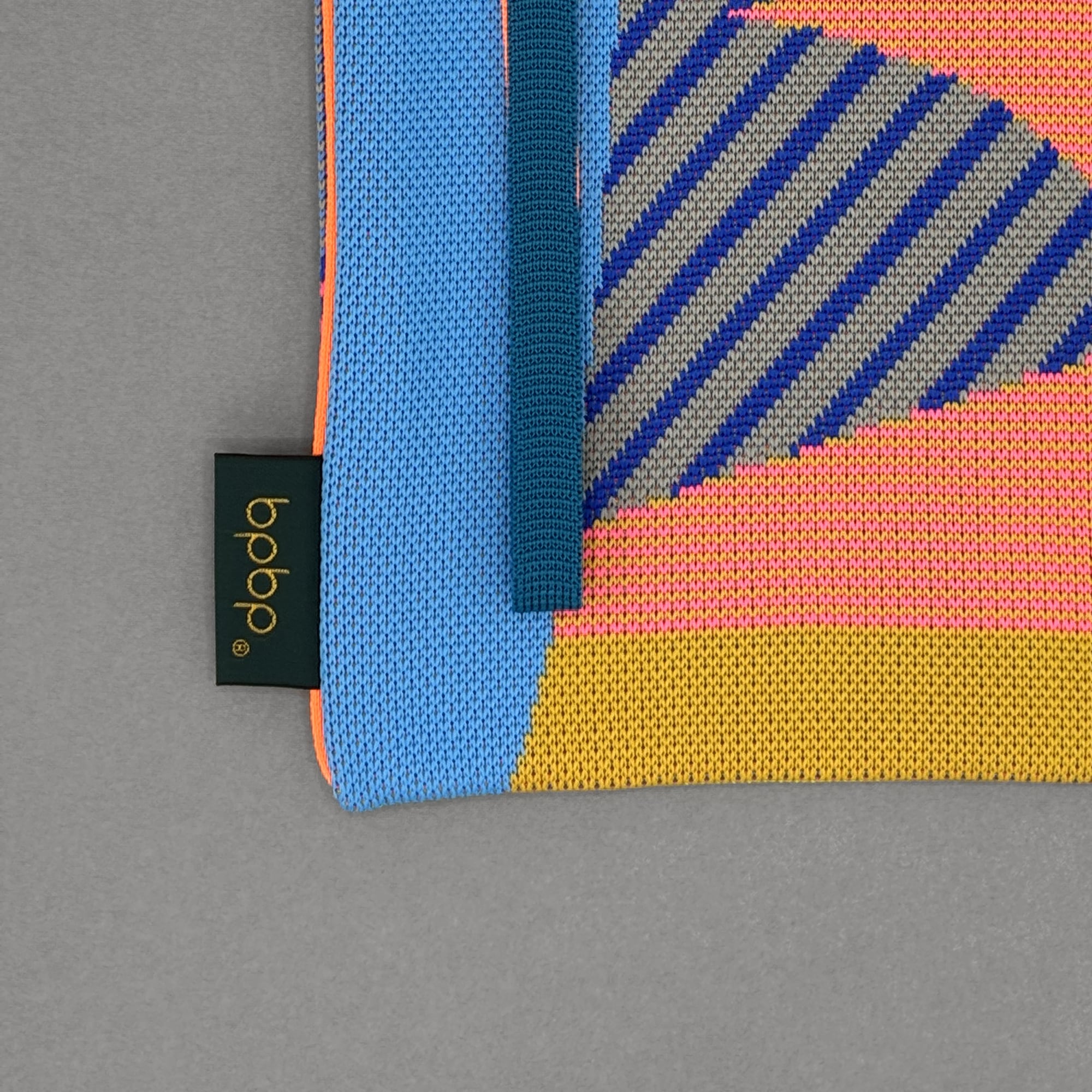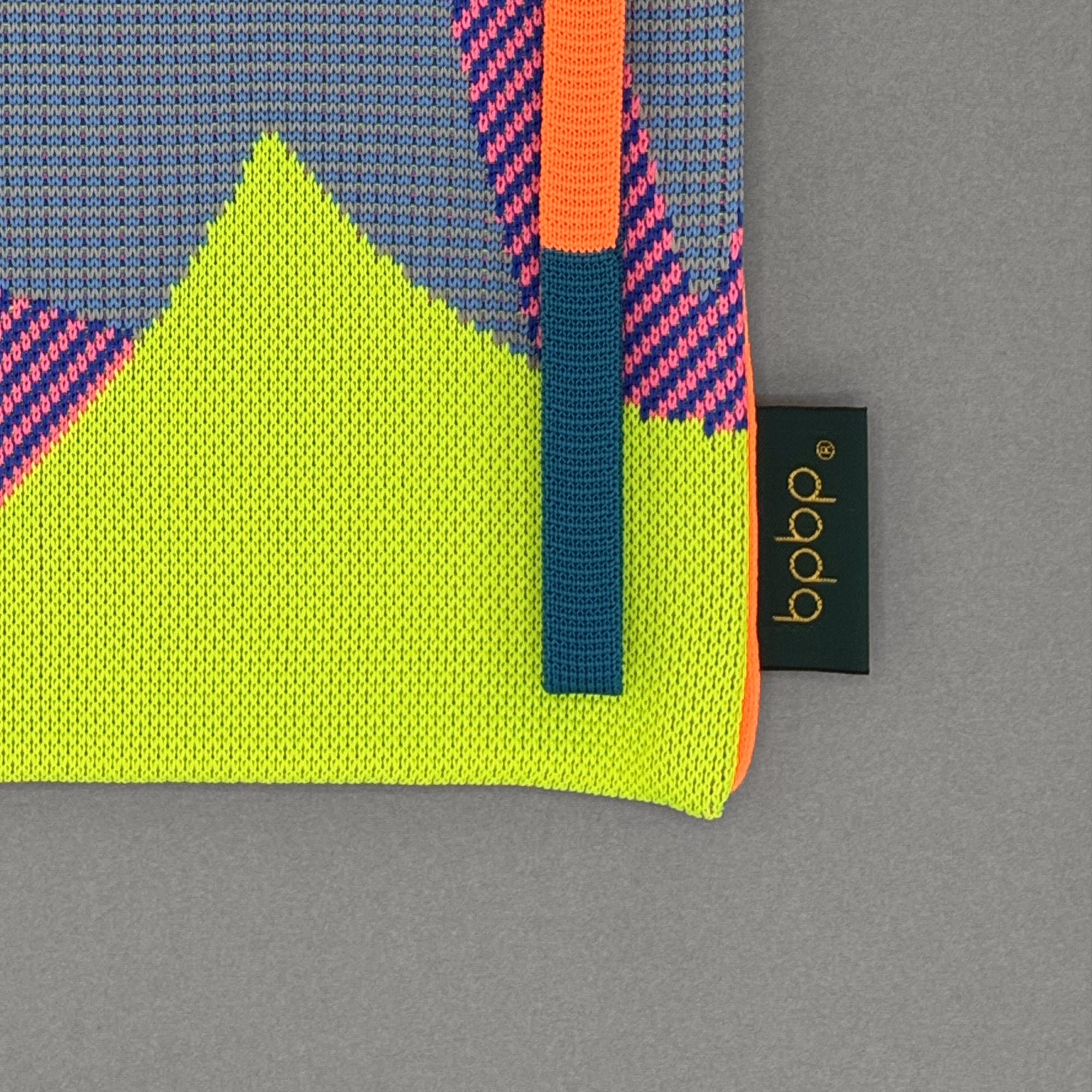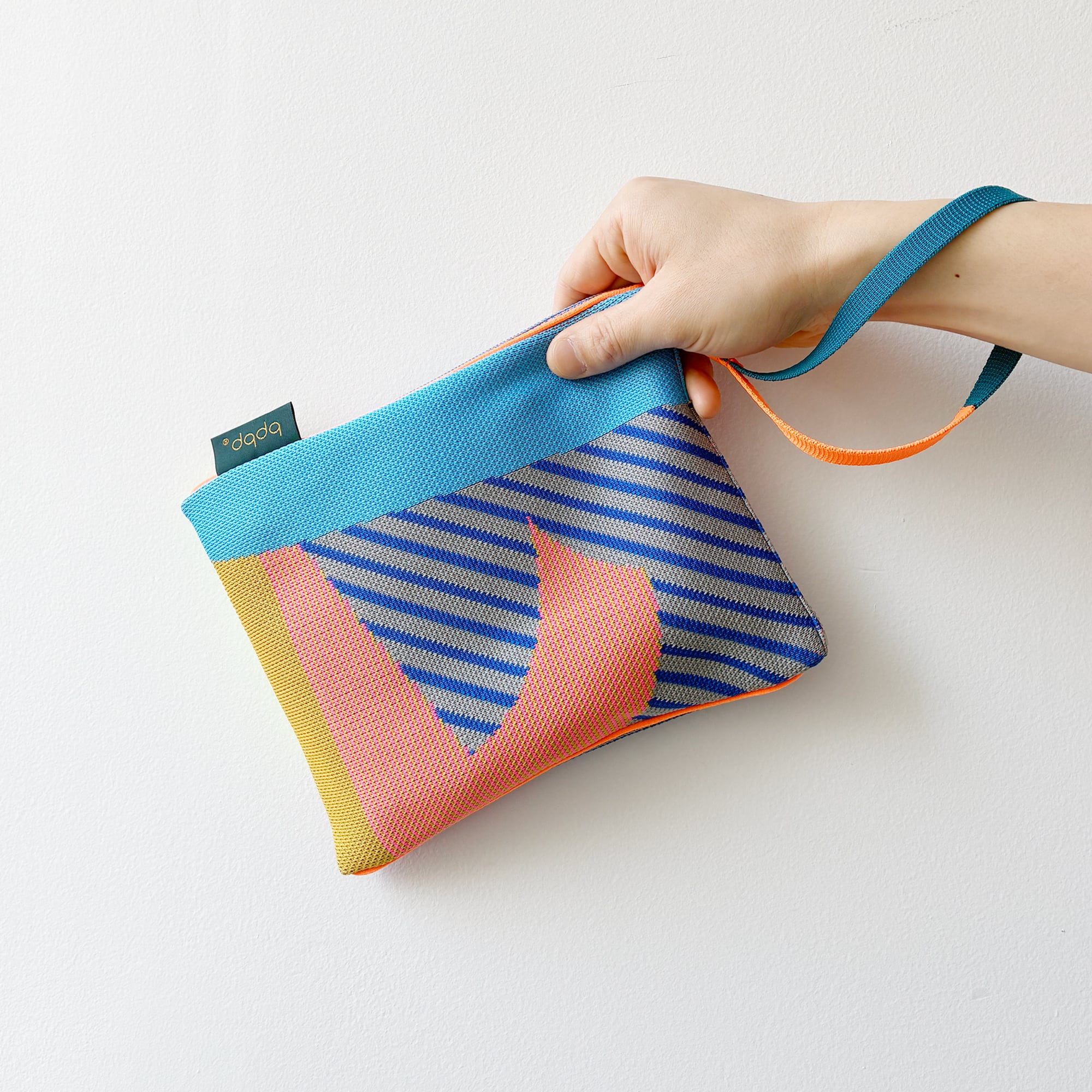 テキスタイルデザイナー 鈴木マサルさんが表現する色柄が再現されたパイピング ハンドストラップ ニットバッグ。