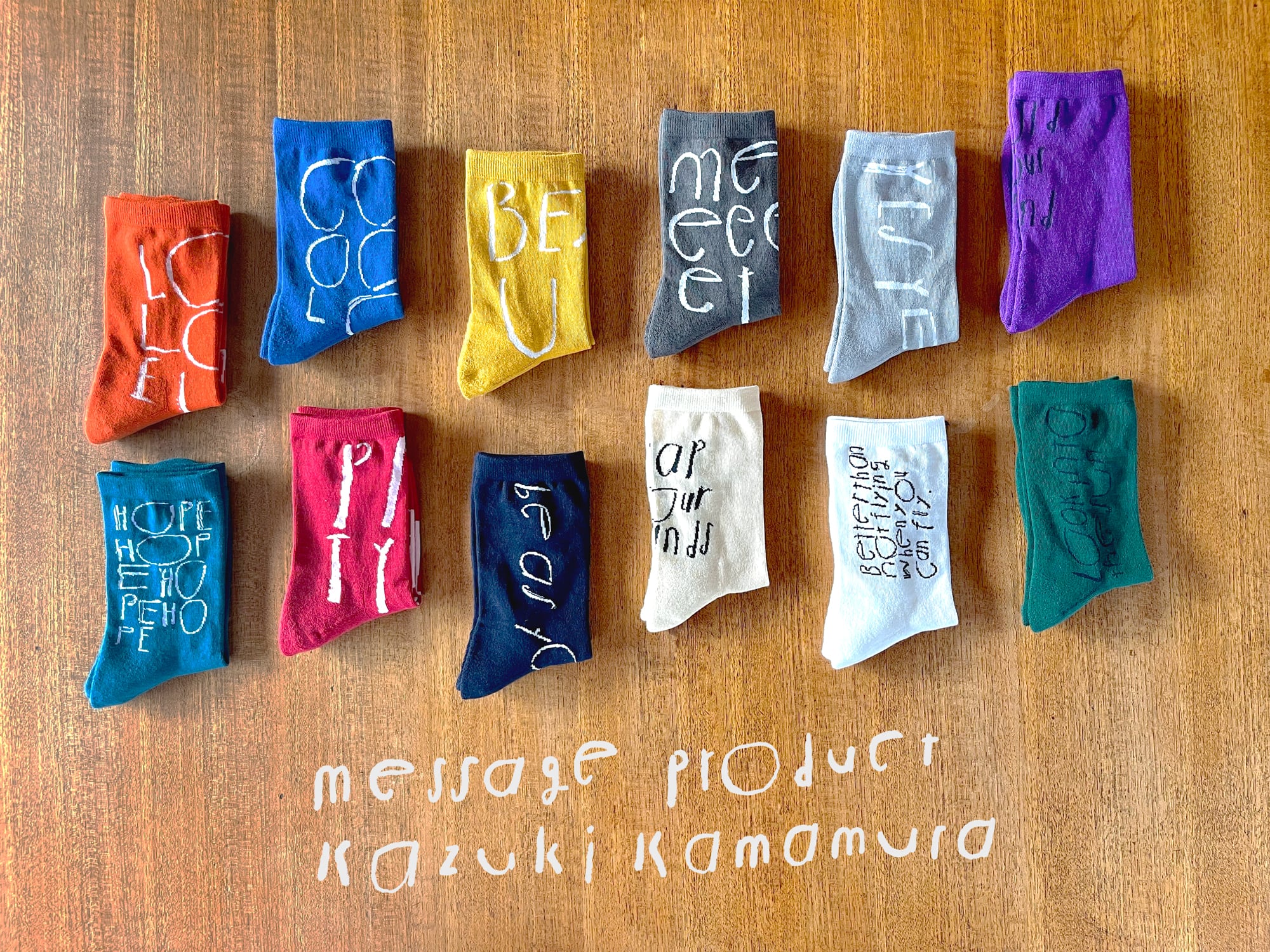 書家・鎌村和貴さんの作品「Clap your hands -手をたたこう-」が再現されたソックスです。